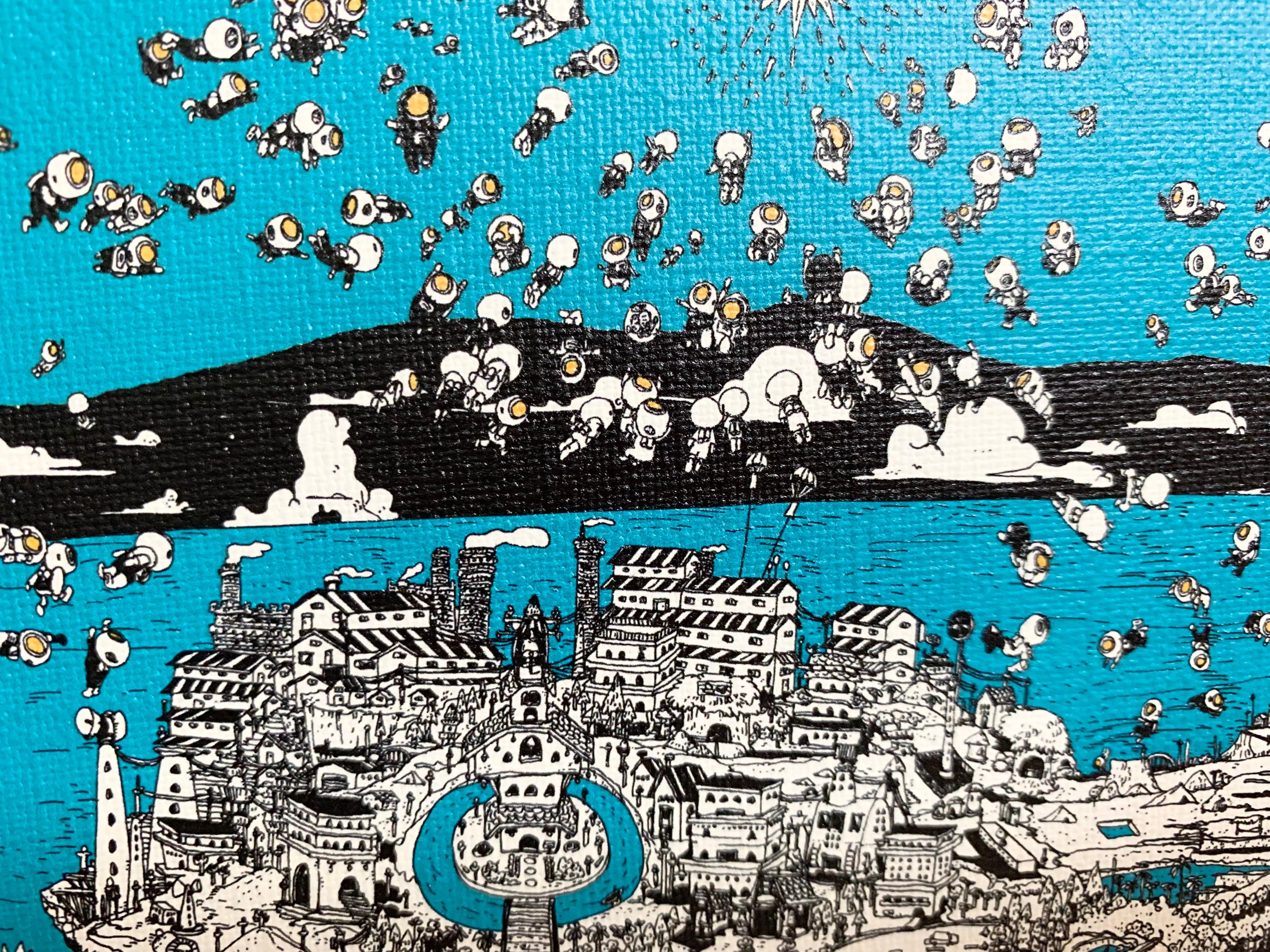 ここは架空のシティ きれいなきれいな水の街 そして今日は1000年に一度だけ無重力になる日 みな宇宙服を着て空中遊泳を楽しんでいます。