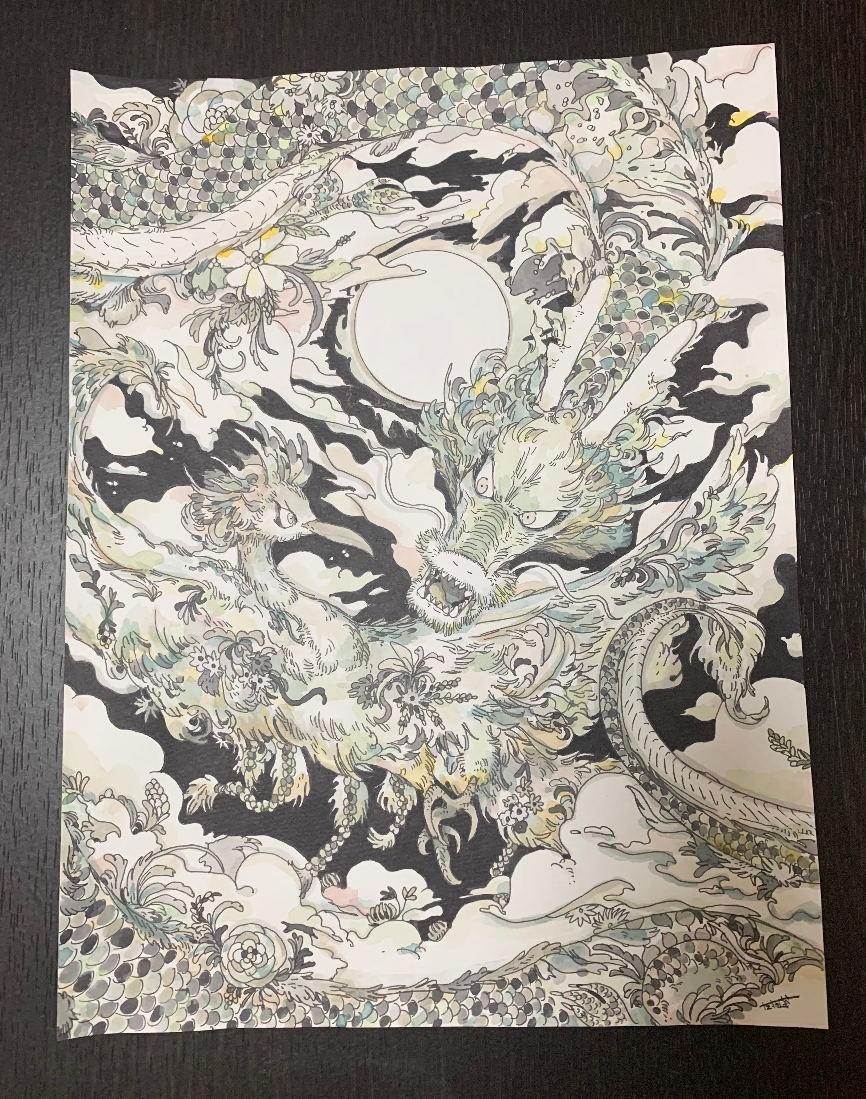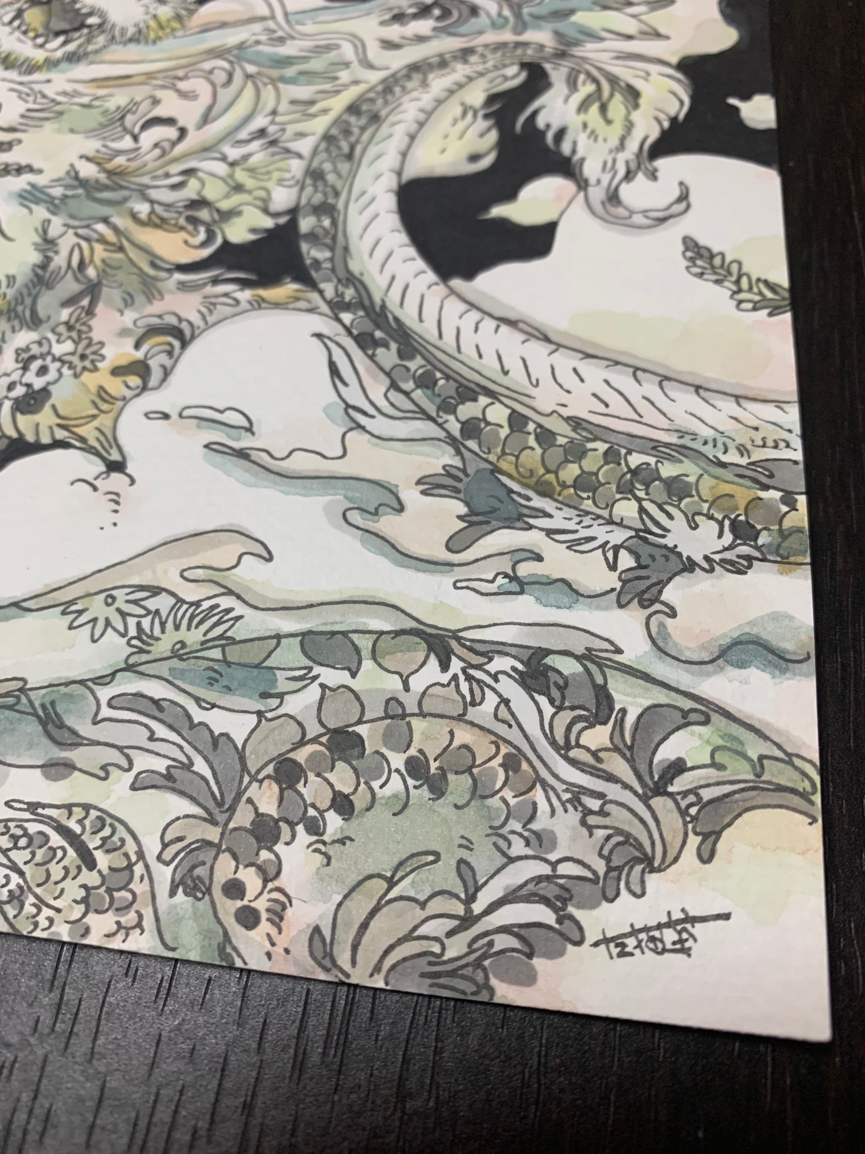 力強いエネルギーに満ちた2匹の幻獣ならどんな願いも叶いそうです。こんなエネルギッシュになりたい。自分もそうありたいと思いながら描きました。