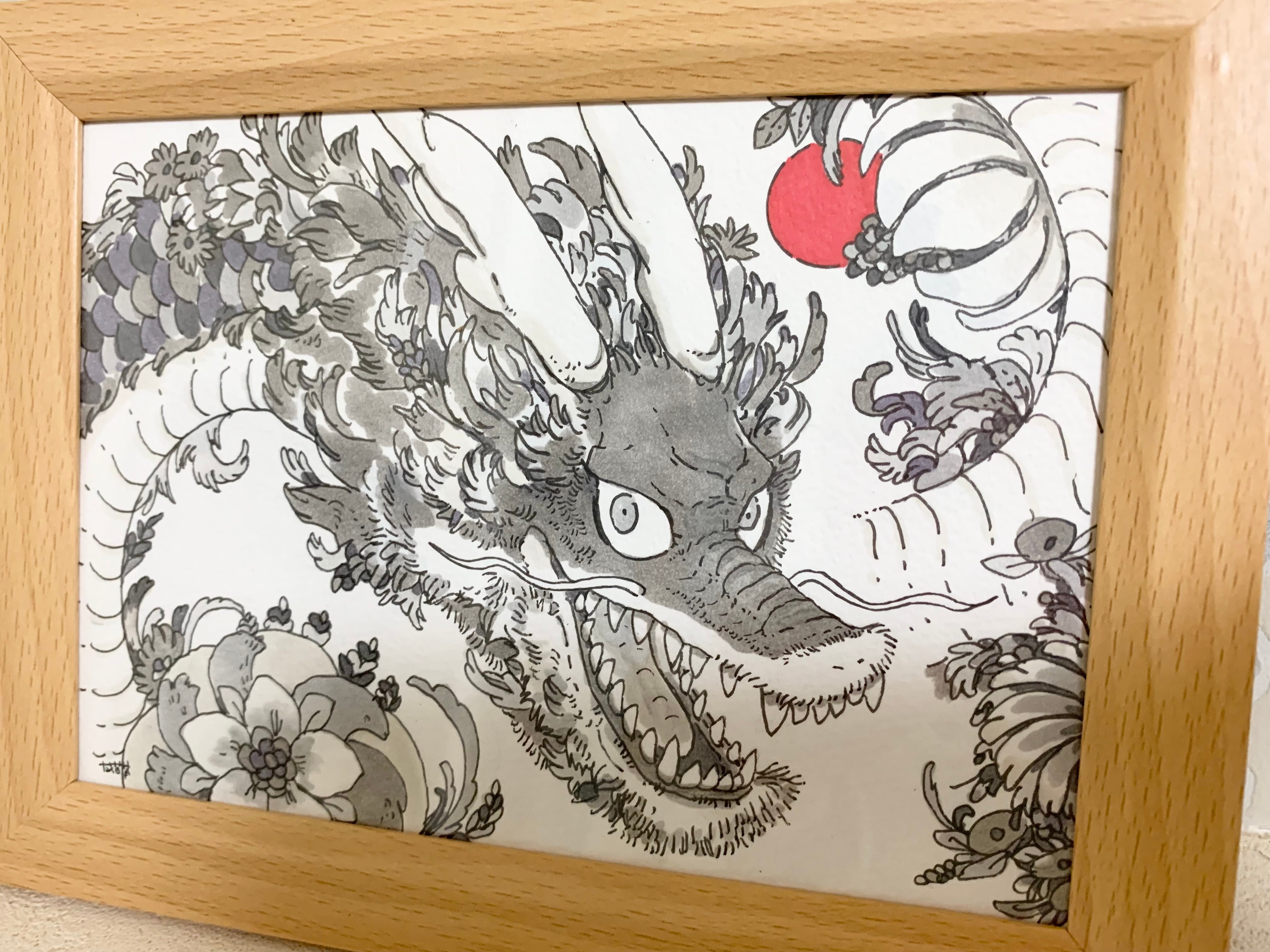 力強く眼光鋭い龍と美しい生命力あふれる花 そして差し込む太陽の光 未来への希望を込めて描きました